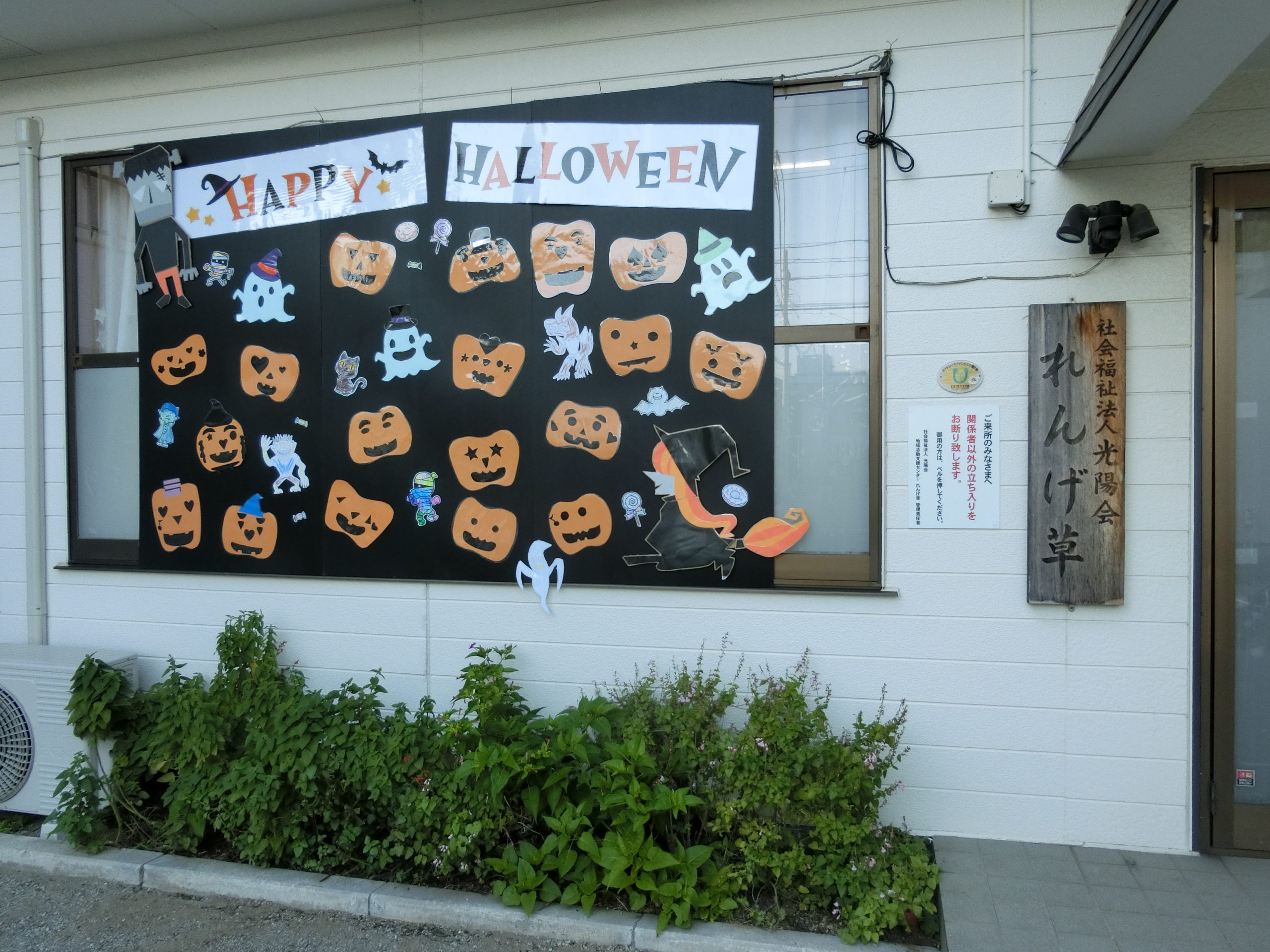 事務所の窓枠いっぱいに各々が作成したカボチャを貼ったパネルを設置し、遠くからでも目立つようにして通行人の方々にも楽しみをお裾分け。短い期間でしたが、一人でも多くの人に「ここは何か面白いことをやってるな~」ということが伝わっていたら幸いです。
