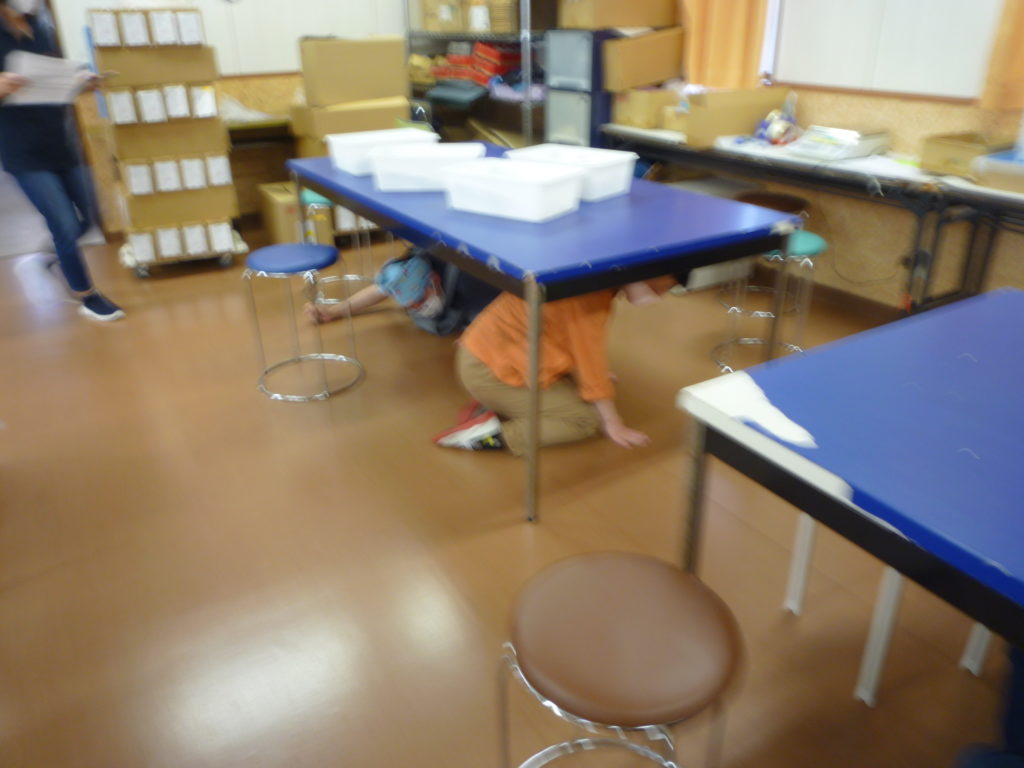 地震から火災発生という流れで避難訓練をしました。