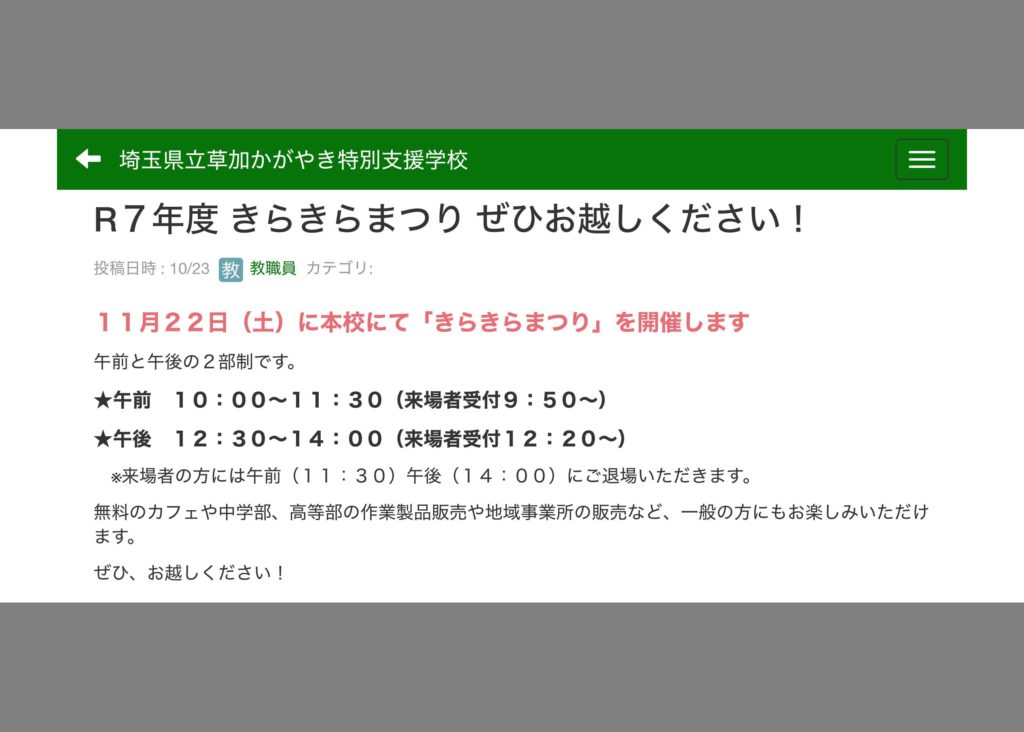 ①きらきらまつり(文化祭) 11月22日(土) 10:00~11:30, 12:30~14:00 埼玉県立草加かがやき特別支援学校
