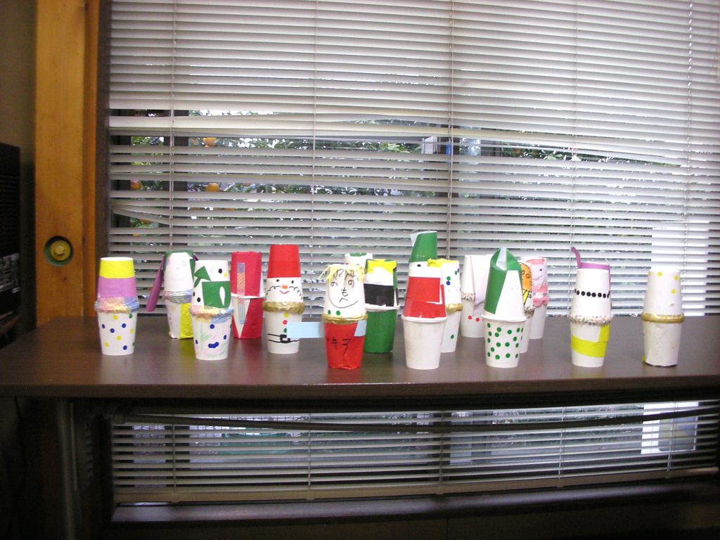 まずは、紙コップに絵を描いたり、色紙を張り付けて、オリジナルにデコレーションしていきます。その中に、枝、どんぐり、カットしたストローなどを好きなように入れて仕上げていきます。